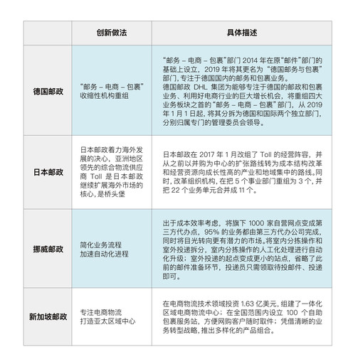 在國外,面對“數(shù)字化”帶來的沖擊,許多國家郵政企業(yè)選擇業(yè)務(wù)重組,以此來提高成本效率,部分郵政企業(yè)甚至剝離非核心業(yè)務(wù),以此釋放資金壓力,著眼未來投資(見圖表1)。
