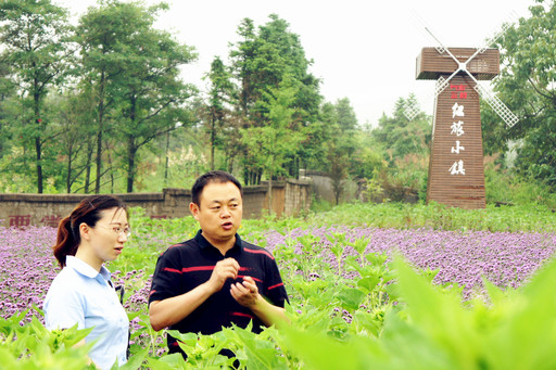 王靜華(右)向郵儲(chǔ)銀行信貸員介紹“紅旅小鎮(zhèn)”。
