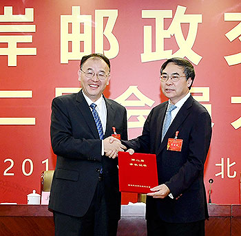 國(guó)家郵政局局長(zhǎng)馬軍勝向集團(tuán)公司董事長(zhǎng)劉愛(ài)力頒發(fā)海峽兩岸郵政交流協(xié)會(huì)第二屆會(huì)長(zhǎng)證書