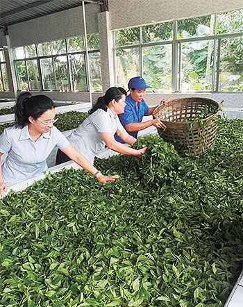 白沙縣支行信貸經(jīng)理走訪白沙茶廠,了解茶葉質(zhì)量。