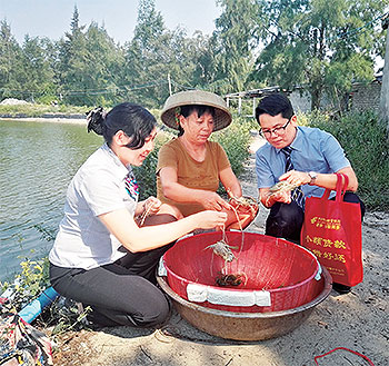 儋州市支行信貸經(jīng)理了解螃蟹養(yǎng)殖戶生產(chǎn)情況。