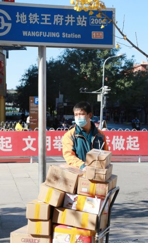 在王府井食品商場鱗次櫛比的商戶中間,譚海波拉著一輛折疊平板車,逐個(gè)鋪位“掃貨”——將商戶們封好的包裹整齊地碼放裝車。不到30分鐘,他已經(jīng)攬收了50多件包裹,這些包裹有的是游客們來京旅游的紀(jì)念品,有的是網(wǎng)友們“雙11”瘋狂購物的“戰(zhàn)利品”。在接下來的幾小時(shí)中,它們將跟隨王府井營業(yè)部的郵車運(yùn)往全國。