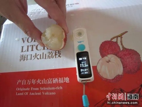 工作人員對(duì)荔枝甜度進(jìn)行檢測(cè)。