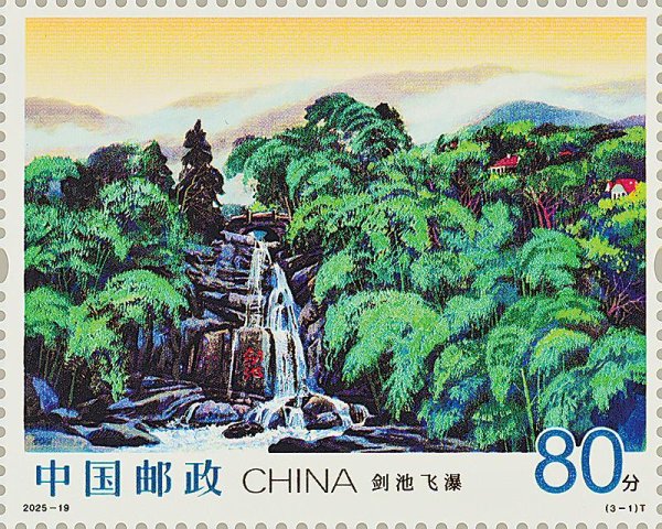 第一枚“劍池飛瀑”(見圖),敘述了莫干山的古老傳說。郵票畫面聚焦劍池瀑布自蒼崖飛瀉而下的剎那,與周邊環(huán)繞的茂林翠柏、蒼巖石壁共同講述干將、莫邪鑄劍的傳奇故事。第二枚“群墅點翠”,呈現(xiàn)了莫干山的建筑風貌。此枚郵票將掩映在翠竹間眾多風格各異的別墅盡收眼底,別墅群落依山就勢,錯落層疊,紅瓦青磚與修竹勁松相映成趣。第三枚“旭光云海”,描繪了莫干山的日出景象。該枚郵票定格了莫干山旭日東升的壯麗景象,旭光臺作為莫干山觀賞日出的絕佳觀景臺,將天地交輝的盛景盡收眼底。