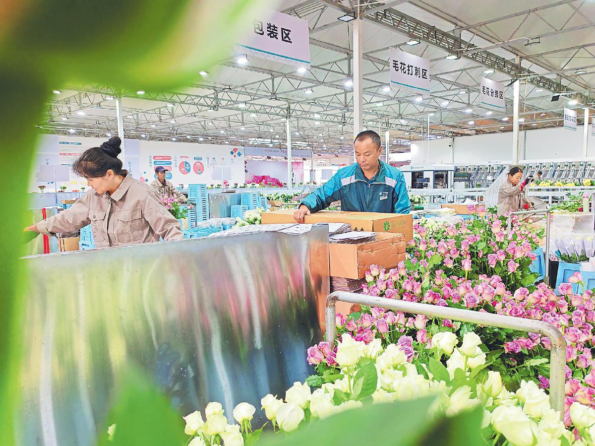 郵政小哥把一箱箱鮮花郵件搬上郵車,讓花香隨郵車駛向機(jī)場(chǎng),奔向全國(guó)消費(fèi)者。