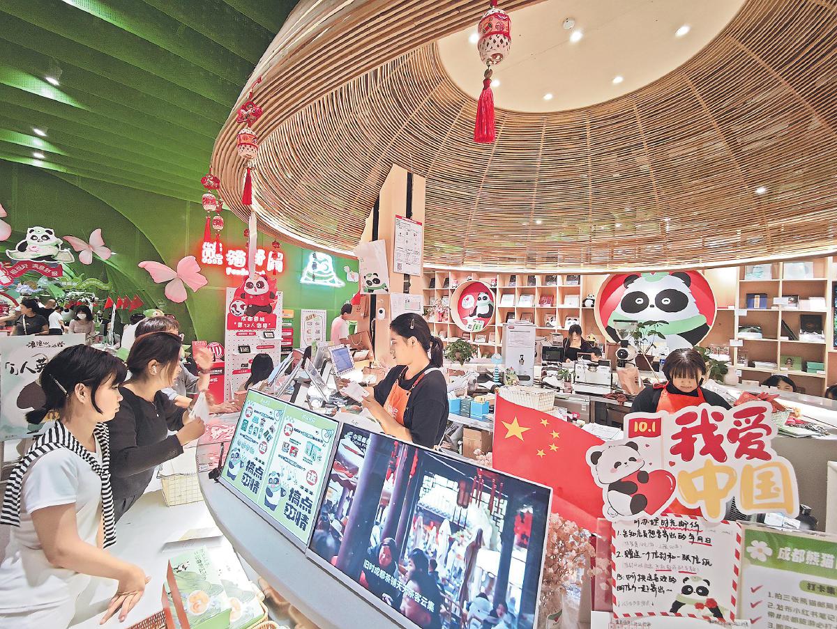 “蓋完這枚‘巴適’方言章,給女兒的國慶禮物就集齊了!”蘇州游客王先生手持“護照本”,在蓋章區(qū)加蓋紀念章。精心挑選明信片的顧客在千款圖案前流連忘返,咖啡區(qū)坐滿了手持熊貓主題飲品的游客,留言墻上貼滿了對祖國和成都的祝福語。這熱鬧的場景,正是熊貓郵局作為文創(chuàng)地標影響力的生動體現(xiàn)。它不僅是一處郵政服務場所,更是連接傳統(tǒng)與現(xiàn)代、傳遞成都文化與熊貓文化的重要樞紐,讓每一份國慶心愿跨越山海抵達目的地,也讓成都的文化魅力隨著一枚枚熊貓郵戳傳播到世界各地。