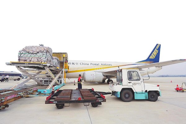 郵航飛機(jī)滿載中郵集運貨物駛向海外。