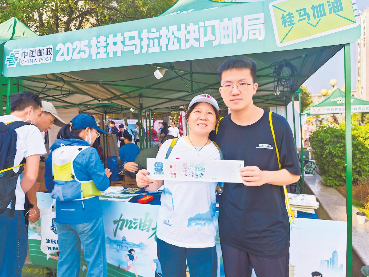 “快閃郵局”不僅提供個(gè)性化明信片打印、紀(jì)念郵戳加蓋等服務(wù),還推出馬拉松連片明信片、嵌入實(shí)物郵票的冰箱貼與手機(jī)支架等文創(chuàng)產(chǎn)品,吸引眾多選手駐足體驗(yàn)。參賽選手王先生說:“我在比賽現(xiàn)場(chǎng)就集到本次馬拉松的2枚定制紀(jì)念郵戳和11枚桂林風(fēng)景章,非常開心,使我這次馬拉松之旅更加難忘?!痹S多跑友還通過明信片打印服務(wù)實(shí)時(shí)記錄參賽精彩瞬間,并現(xiàn)場(chǎng)寄遞分享。