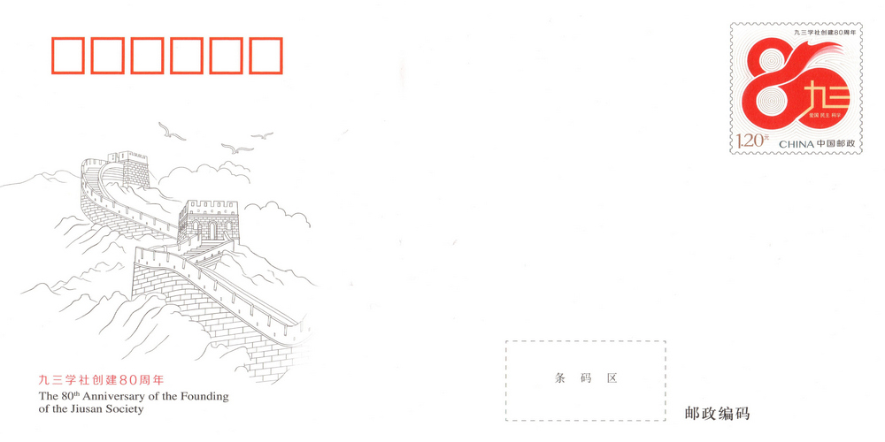 中國(guó)郵政定于2025年9月3日發(fā)行《九三學(xué)社創(chuàng)建80周年》紀(jì)念郵資信封1套1枚。詳情如下: